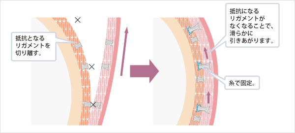 皮膚を引き上げる際に、一度、靭帯(リガメント)を切り離し、皮膚を引き上げたところで再度筋膜に固定を行います。これによって皮膚に無理な力もかからずスムーズに引きあがり、後戻りもしにくくなります。