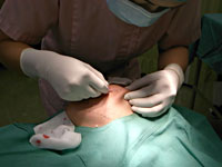 皮膚をつまみ、たるみの気になる部分の皮下に連続で挿入針を挿入します。